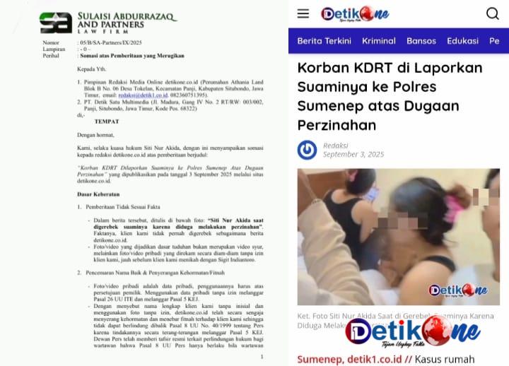 Sumenep, detik1.co.id // Kuasa hukum SNA resmi melayangkan somasi kepada redaksi media online detikone.co.id terkait pemberitaan berjudul “Korban KDRT Dilaporkan Suaminya ke Polres Sumenep Atas Dugaan Perzinahan” yang terbit pada 3 September 2025.